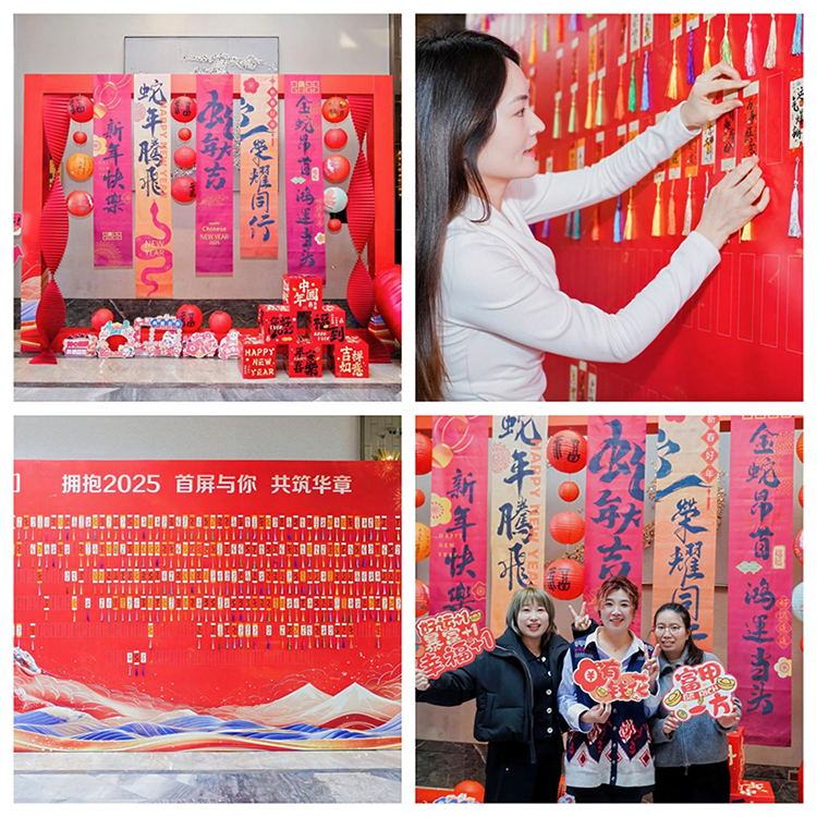 “平安喜樂”、“多財(cái)多億”、“諸事皆宜”等各色國(guó)風(fēng)箋條掛滿簽到墻,大家紛紛寫上祝福語(yǔ),祈愿新年都有好運(yùn)勢(shì)。另一邊,精致的新年打卡區(qū)吸引了伙伴們的目光,擺起Pose來(lái)上新年第一拍。